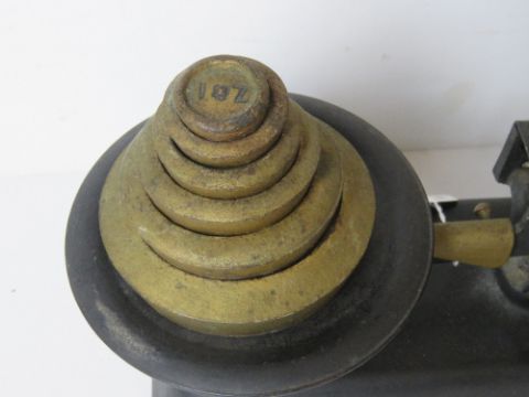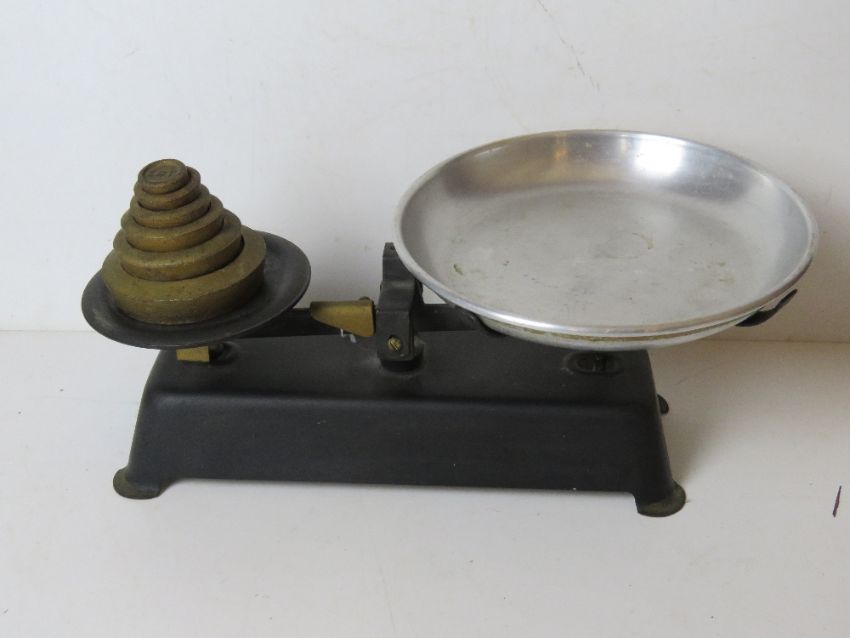A pair of vintage balance weighing scales with set of brass graduated weights.