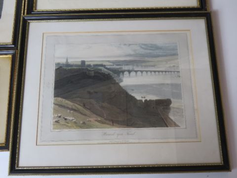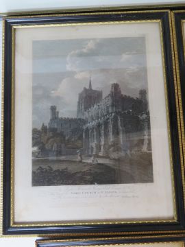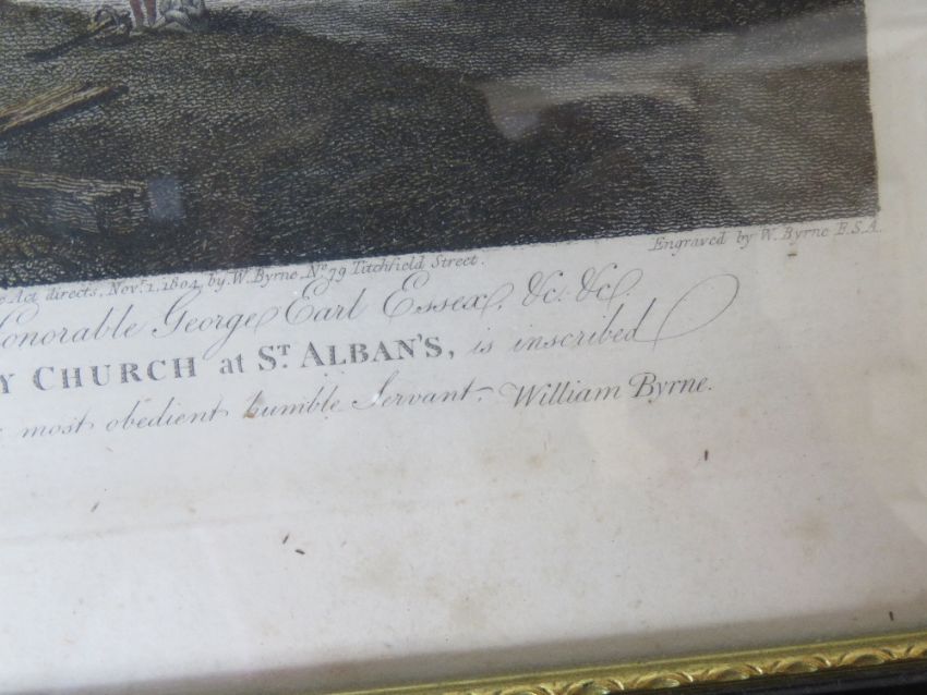 A collection of steel engravings in similar Hogarth style frames including two of Abbey Church at St Albans engraved by W. Byrne, Berwick upon Tweed and Steam boat on the Clyde near Dumbarton each drawn and engraved by William Daniell, Hendon dated 1807, and The Fighting Temeraire J.M.W. Turner. Various sizes.