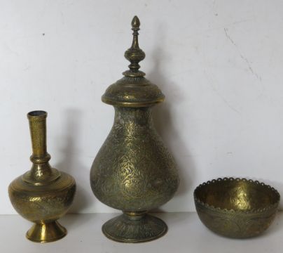 A quantity of Persian influence items including a brass and white metal needle case, two brass boxes, vase, etc.