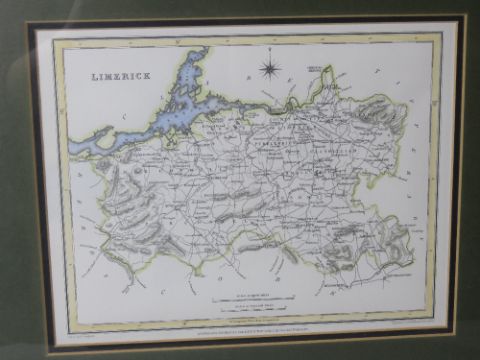 A hand coloured reproduction map of Limerick, Ireland, from Lewis' Topographical Dictionary, framed and mounted, sight size 24 x 19cm, overall size 41 x 34cm.