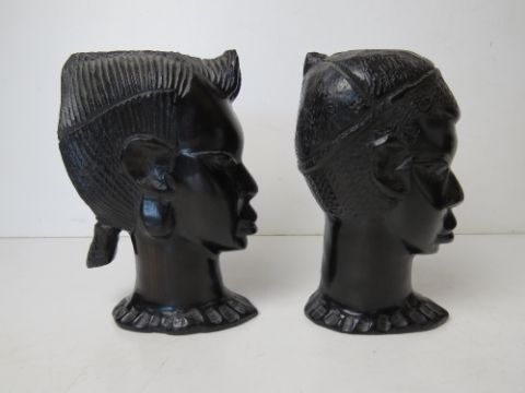 A pair of African carved heads being male and female, each approx 17cm high.