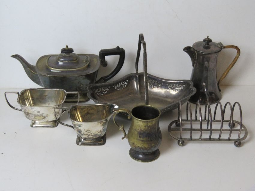A quantity of silver plated wares including teapot with wicker wrapped handle, teapot with sugar bowl and milk jug, toast rack, etc.