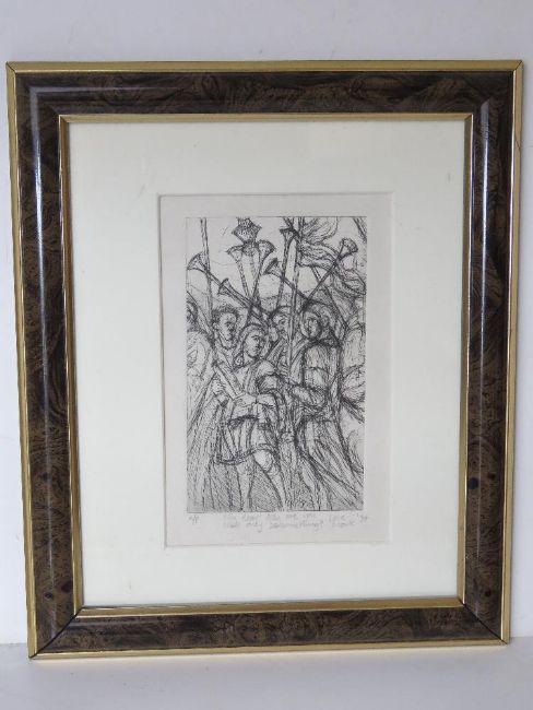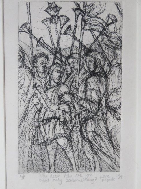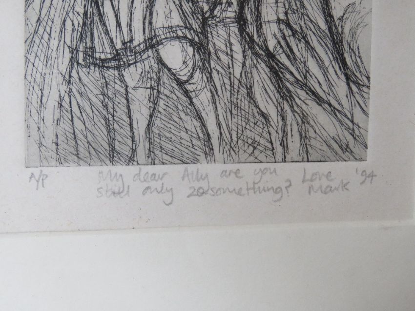 A pen sketch with dedication in pencil below dated '94, framed and glazed, overall size 25 x 30cm.