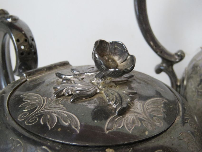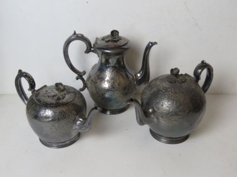 A Walker & Hall silver plated teapot, hot water pot and matching coffee pot, each having floral finial and of substantial form.