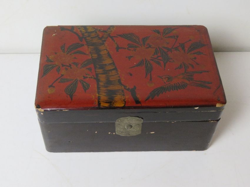 An Oriental style black and red lacquered box.