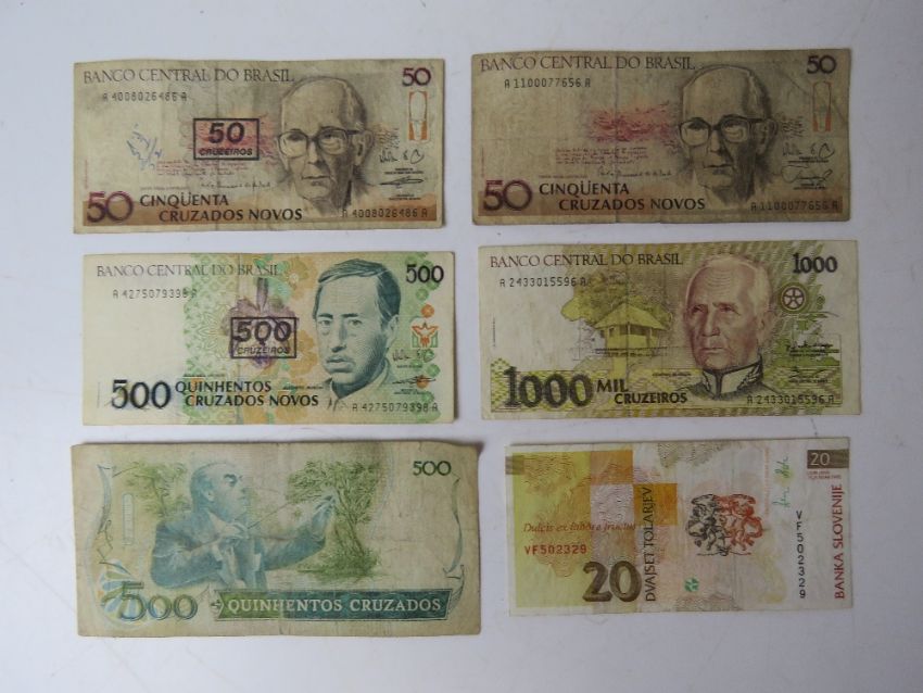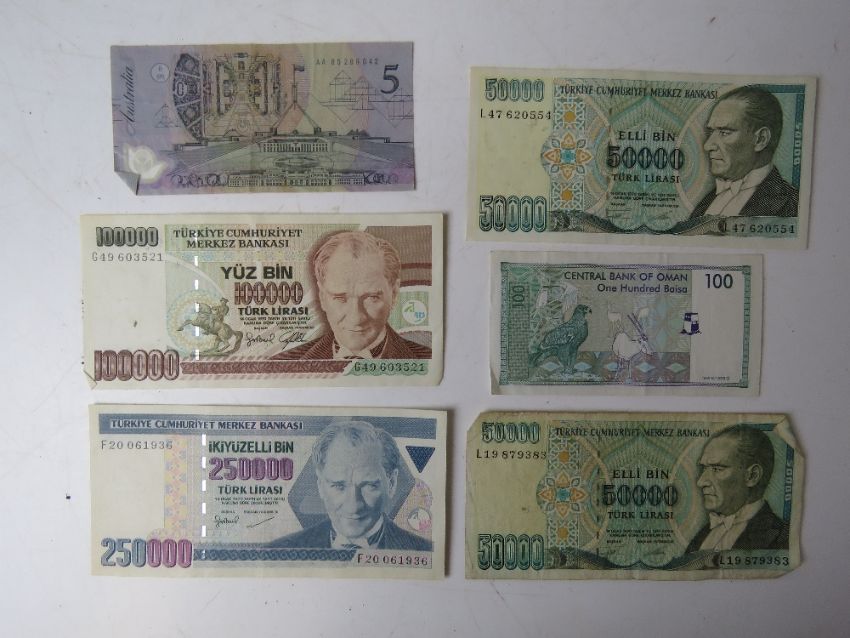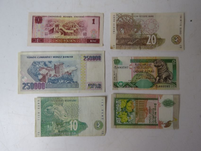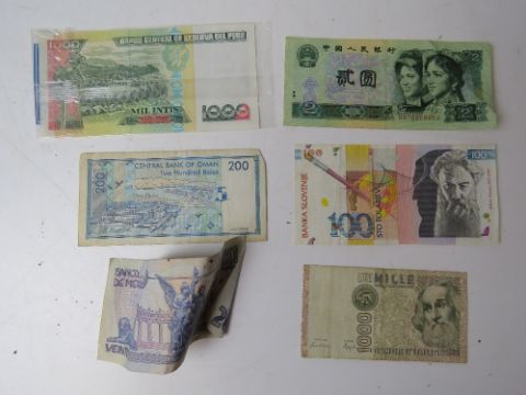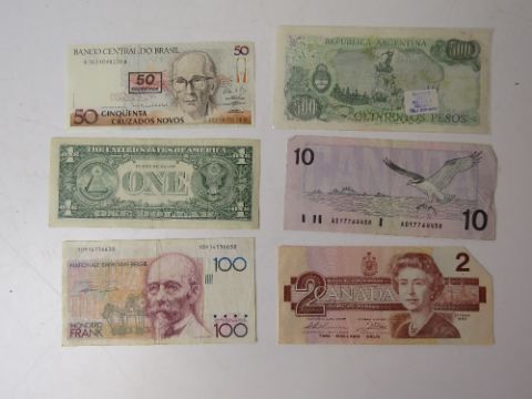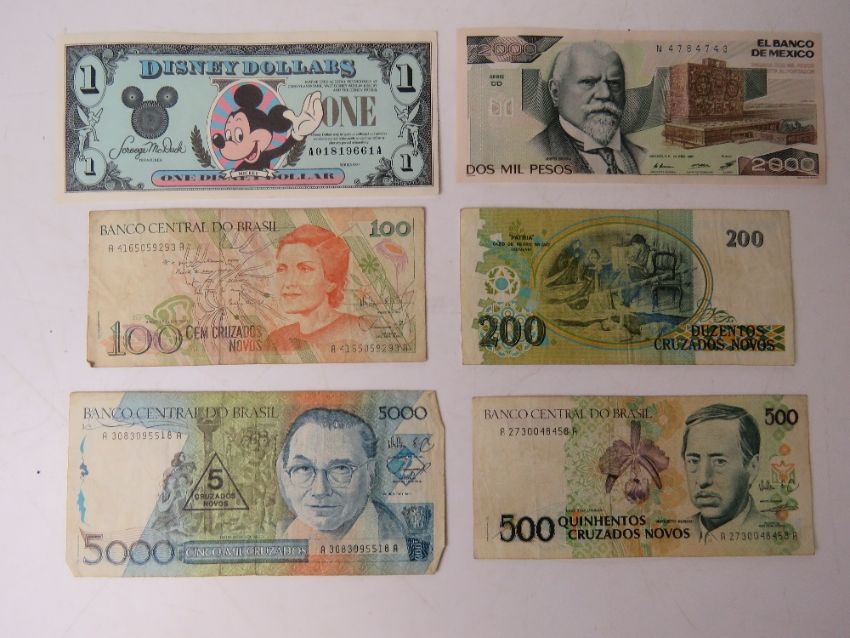 A collection of assorted world paper bank notes including; Peru, Oman, Slovenia, Italy, Guernsey, Singapore, Brazil, Argentina, USA, Canada, etc. Also a Disney Dollar.
