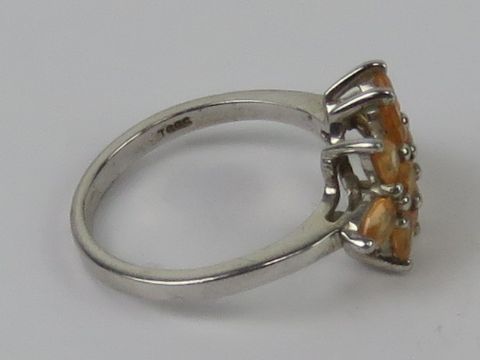 A silver and peach coloured stone cluster ring, stamped 925, size P.
