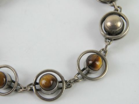 A silver geometric design tiger's eye cabachon bracelet stamped 925 and measuring 21,5cm in length.