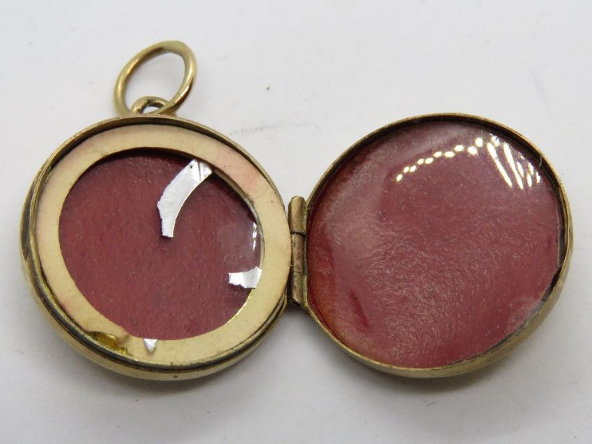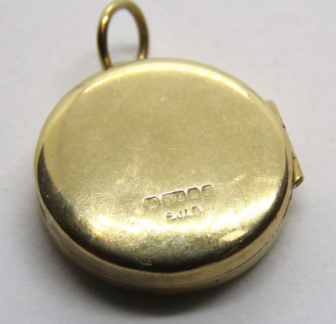 A 9ct gold round locket having floral engraving to front, hallmarked 375, 2.2g.