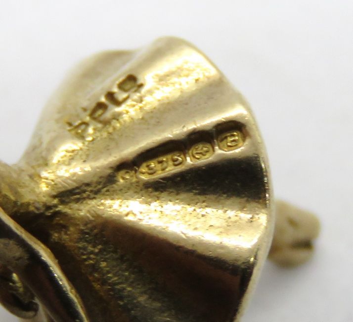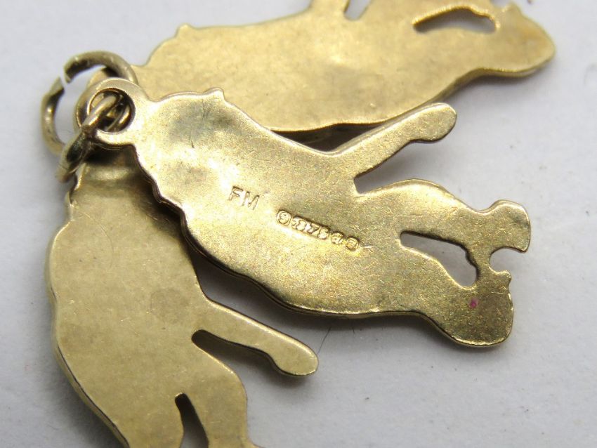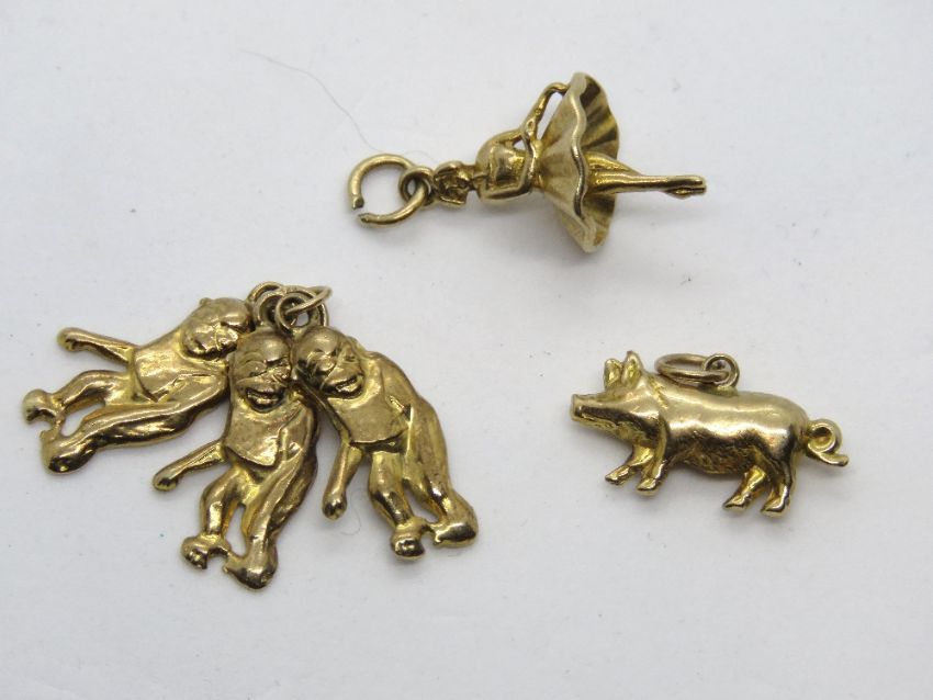 Three 9ct gold charms, a 375 hallmarked ballerina, a 375 hallmarked trio charm, and a pig stamped 9ct. Total weight 3.9g.