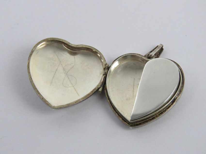 A silver heart shaped locket having unusual trinket / memory box within, stamped silver, approx 2.3cm wide.