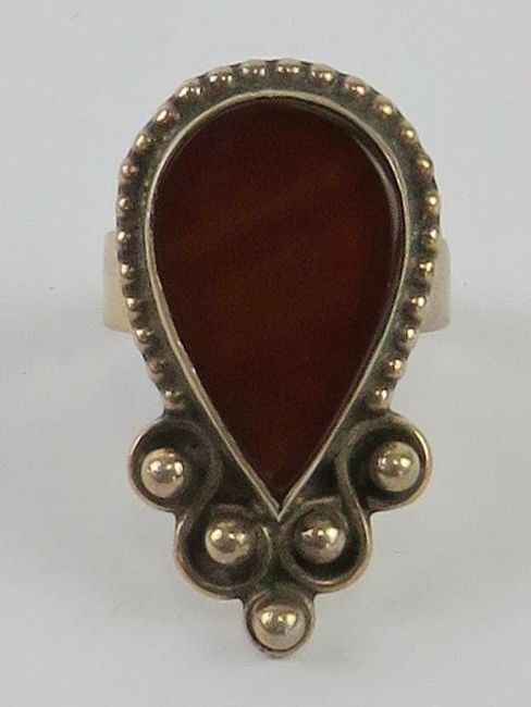 A handmade Indo-Asian design ring set with banded carnelian type stone, stamped 925, size P-Q.