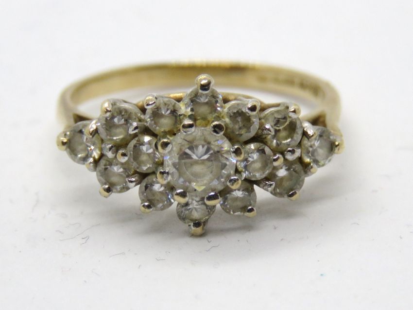 A 9ct gold cluster ring having central white stone cluster with trio of white stones to each shoulder, hallmarked 375, size K, 2.2g.
