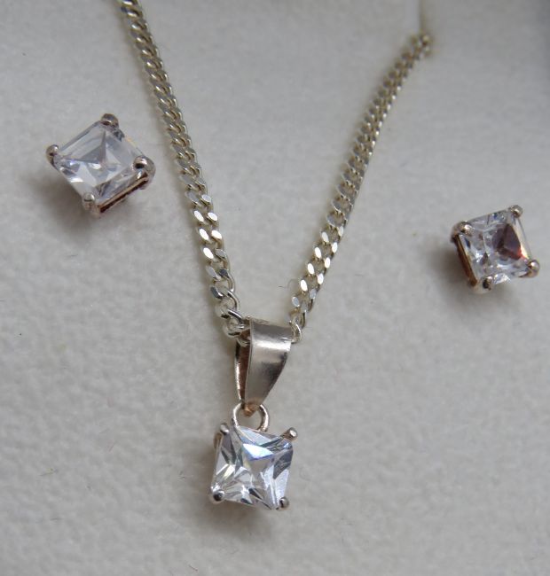 A silver suite comprising pendant on chain and stud earrings all having square shaped white stone, stamped 925 to the chain, in presentation box.