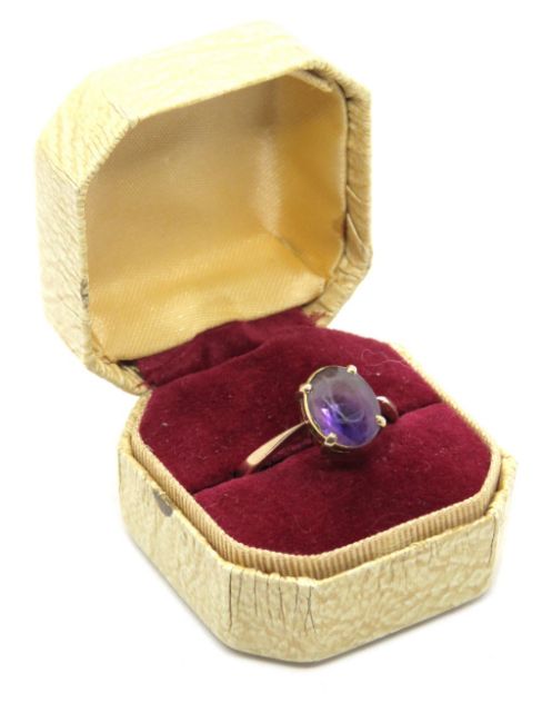 A vintage amethyst ring, the oval cut stone claw set in band stamped 9ct, size Q-R, 2.8g. In vintage ring box.