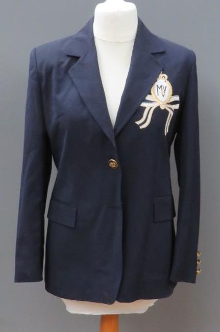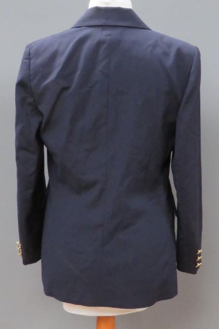A 100% wool Italian navy coloured jacket having enamelled crown themed buttons upon, size 44, approximate measurements 40" chest, 29" length to back, 16" underarm sleeve.