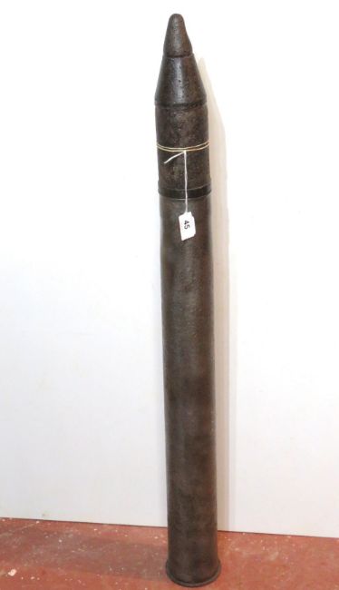 An inert WWII German Pak 40 7.5cm AP shell with projectile, semi relic condition, small dent near the top of the projectile noted.