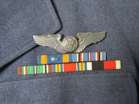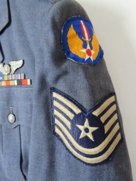 A WWII US Airforce dress tunic, shirt and tie. Tunic having medal bars upon, USAF Europe badge and the rank of technical sergeant. Size 38R. Shirt is a type IV and size 15x33.