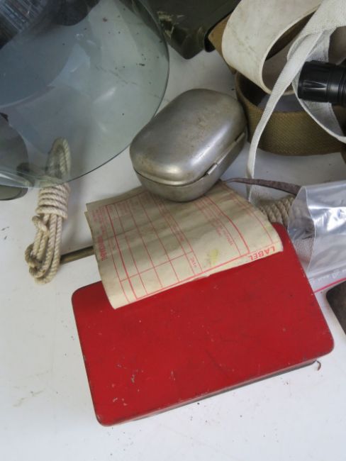 A quantity of assorted militaria inc; pull throughs, lighter, soviet belt buckle, ak slings, helmet, parade belt, flare cartridge case, WWII British soap pot, relic WWII torch, 1951 prilect travel iron, torch, etc.