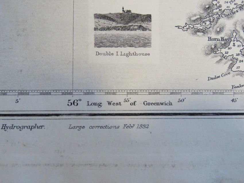 Navigational chart; engraved by Edward Weller, Small Corrections published 1937, being Coast of Labrador, Cape St Charles to Sandwich Bay, compiled from surveys by Navigational Lieutenant W F Maxwell R.N., measuring approx 102 x 70cm.