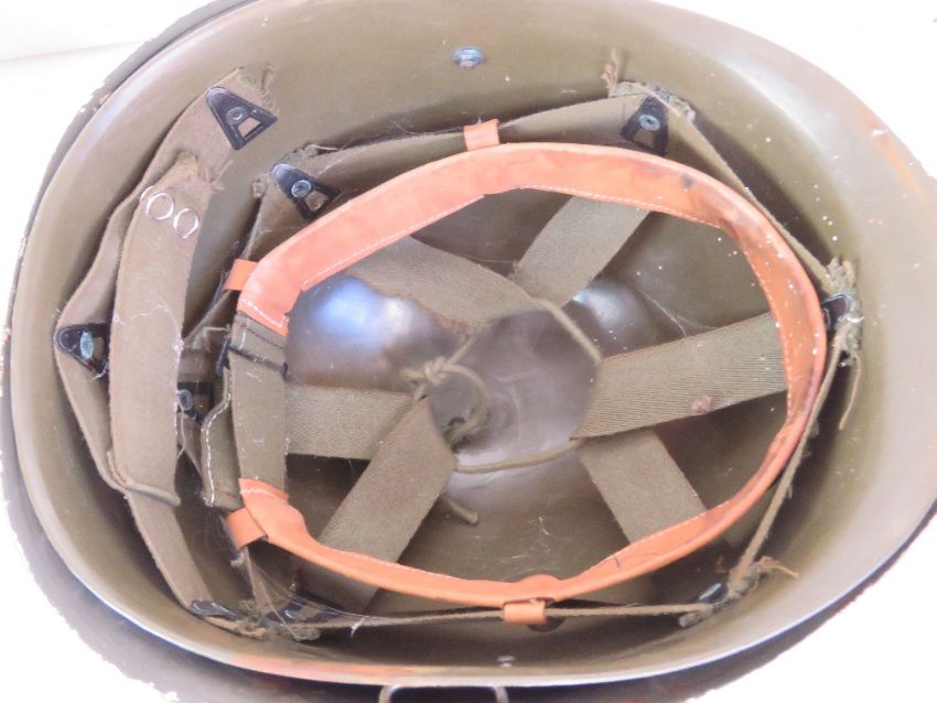 A US M1 helmet with liner and reproduction chin strap, liner dated 1971. Together with a repainted Vietnam US M1 helmet with liner.