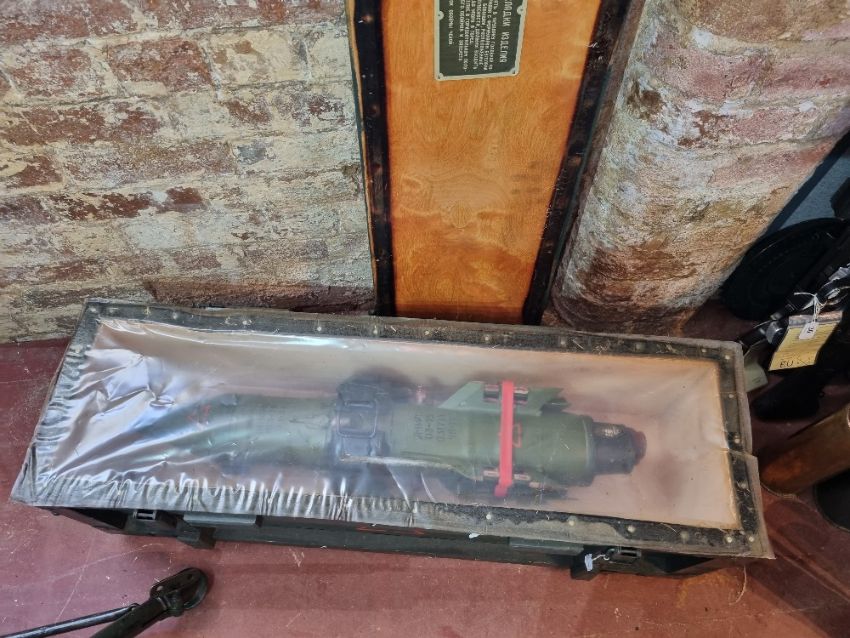 An inert Soviet 9M14 Malyutka missile in transit case.