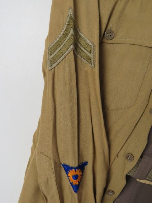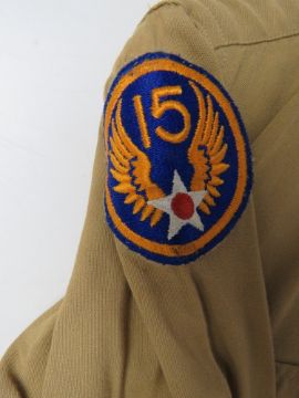 A WWII USAF field shirt, trousers and belt, bearing 15th Airforce patch and Specialist Signal patch upon.