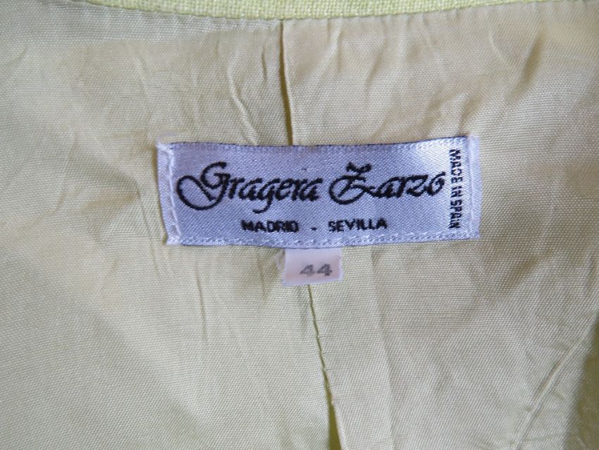 A 100% linen ladies jacket in lime green by Gragera Larzo Madrid Spain, size 44.