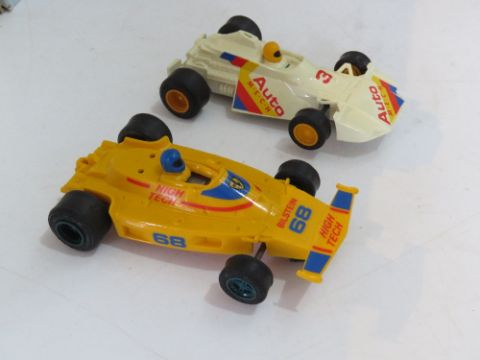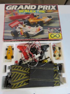 Scalextric Grand Prix track and two racing cars with controllers.