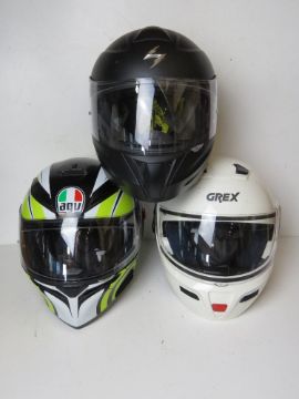 Three motorcycle helmets for decorative purposes only.