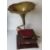 A vintage gramophone with a wind mechanism and handle, having brass horn, bearing HMV label and HMV head.