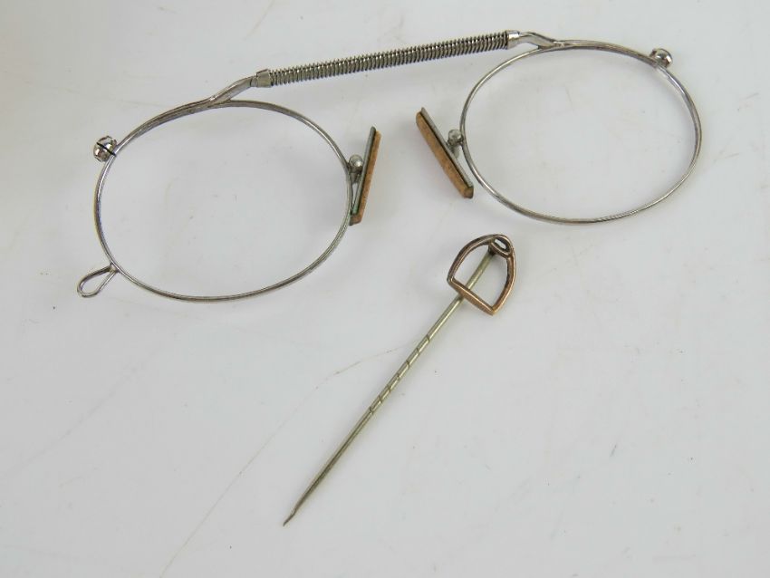 A hunting themed stock pin having yellow metal terminal in the form of a stirrup within original fitted leatherette case, together with a pigskin leather horseshoe themed collar box, two plasticised napkin rings, etc.