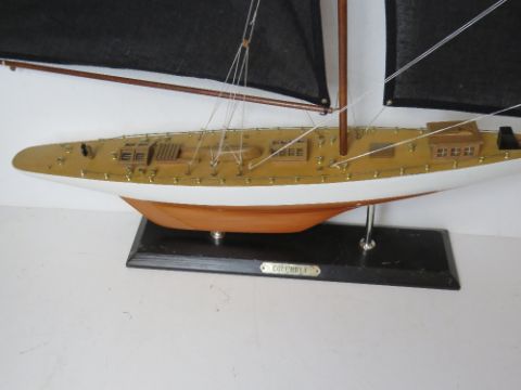 A model pond yatch 'Columbia' having black sails, approx 82cm in length.
