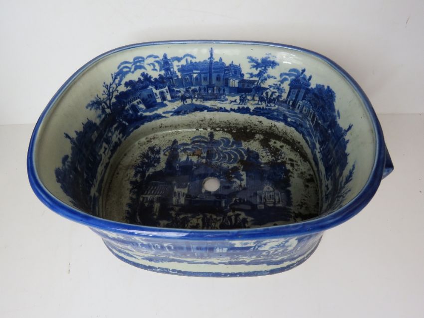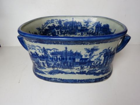 A large blue and white planter, blue glaze, Italian style city scenes upon. Mark to base Victoria Ware Ironstone, approx 47cm wide.