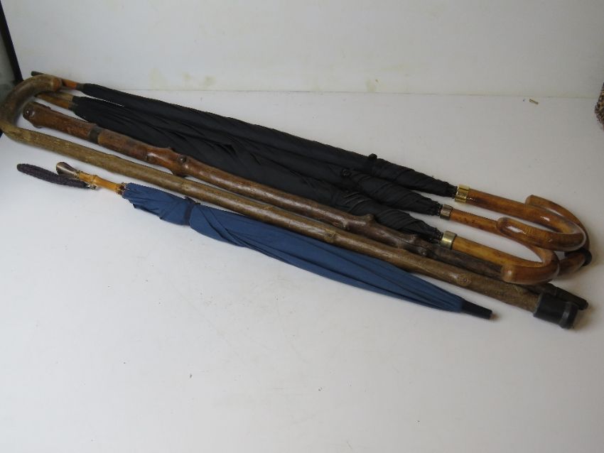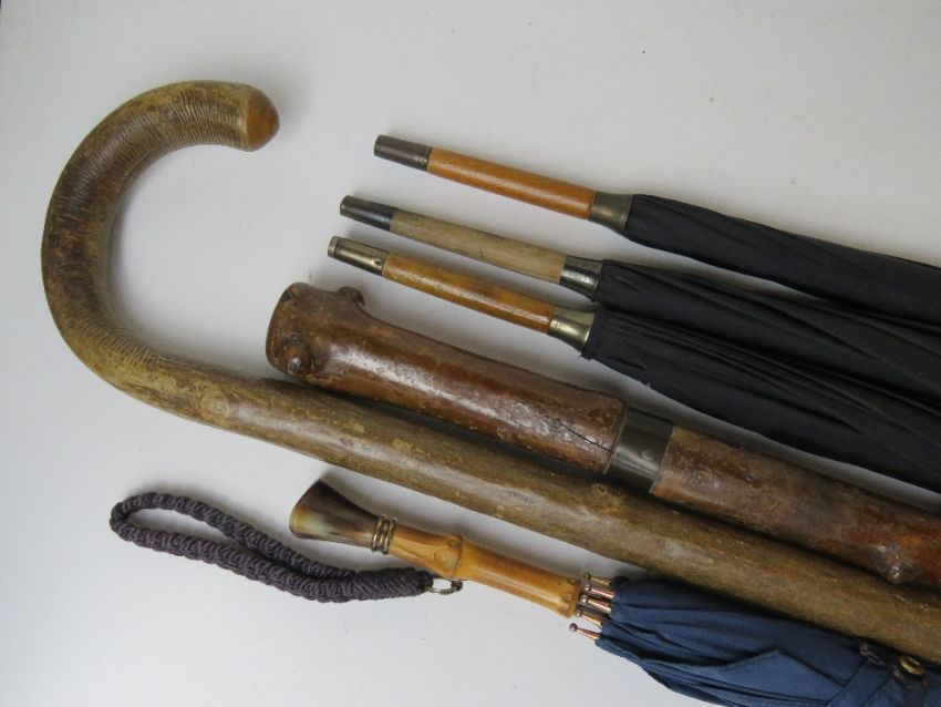 A quantity of vintage umbrellas and walking sticks, inc an umbrella with 9ct rolled gold collar.