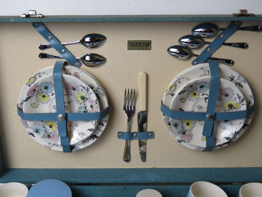 A Brexton picnic basket containing cups, saucers, plates, thermos, etc.