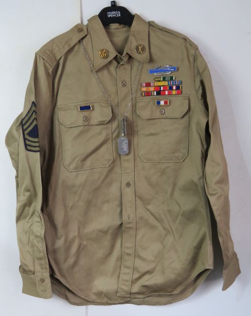A US Khaki shirt , with original stamping on the inside of the shirt, size 15 ½ x 34, having ribbon bars, patches and badges.