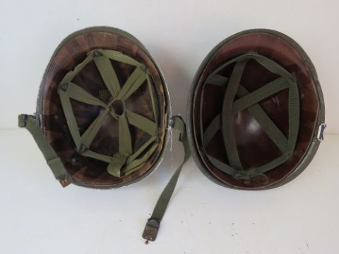 A US M1 helmet with liner, chin strap and sergeant stripes, together with a painted WWII US M1 Helmet with liner. Two items.