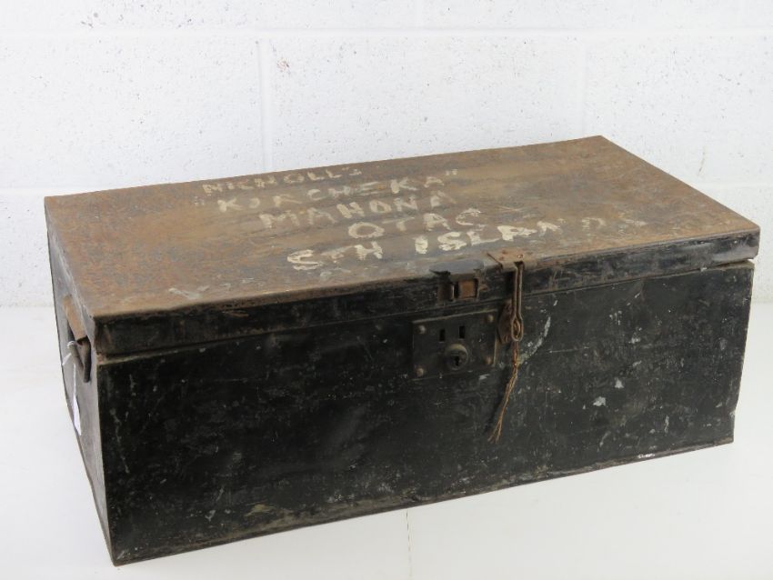 A black painted metal trunk.