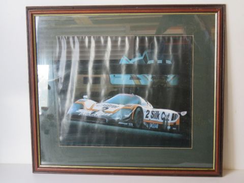 A large photographic print of a Silk Cut Castrol Jaguar XJR Race Car. Approx measuring 54 x 61cm.