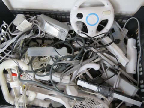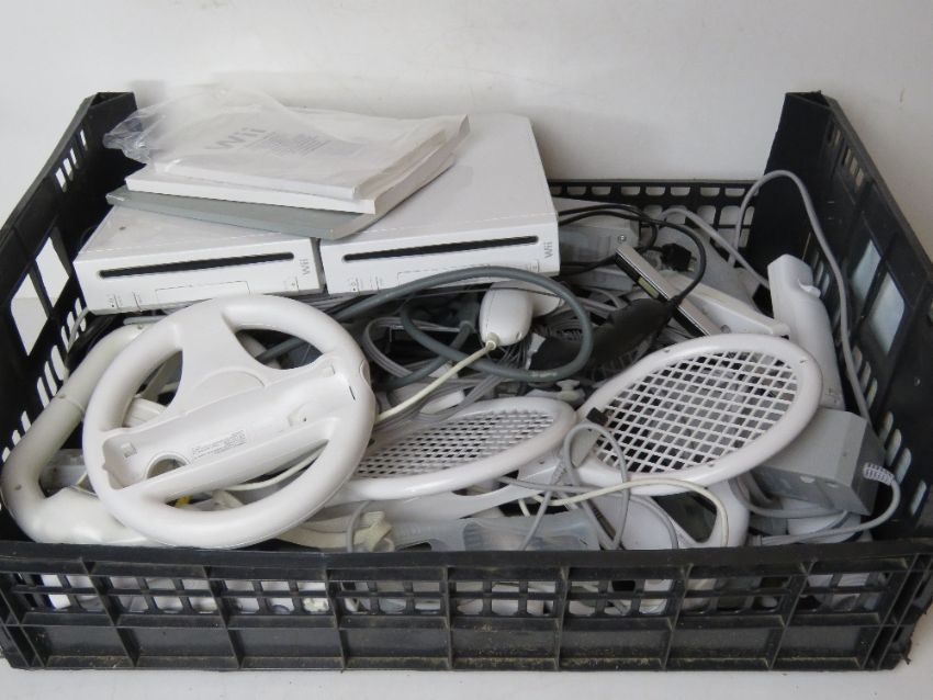 Two Nintendo Wii consoles with various cables and accessories. Disclaimer - all items in this sale are sold as untested without guarantee.