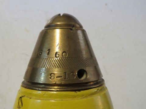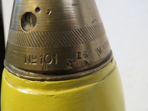 An inert WWI 18pr shell with fuse, case dated 1917. No.101 fuse unscrews and dated 1916, approx. 55cm tall.