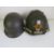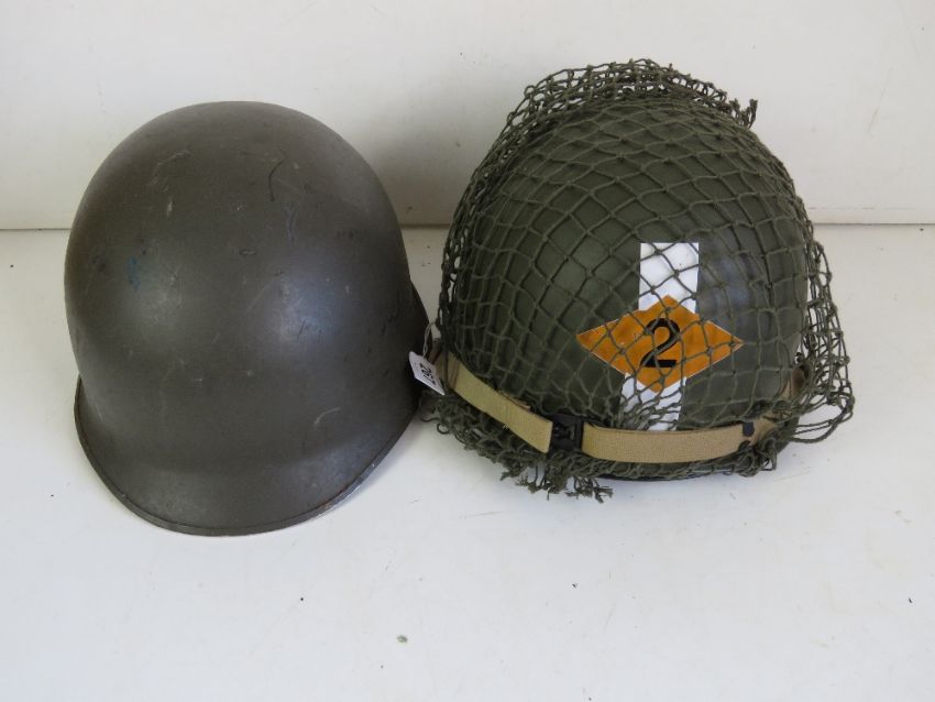 Two US M1 helmets, one with liner, one having been repainted.