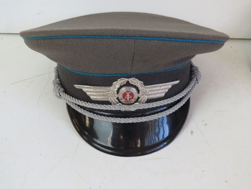 A Soviet Officers cap, size 55, peak a/f, can be repaired, and an East German NVA visor cap, size 58.