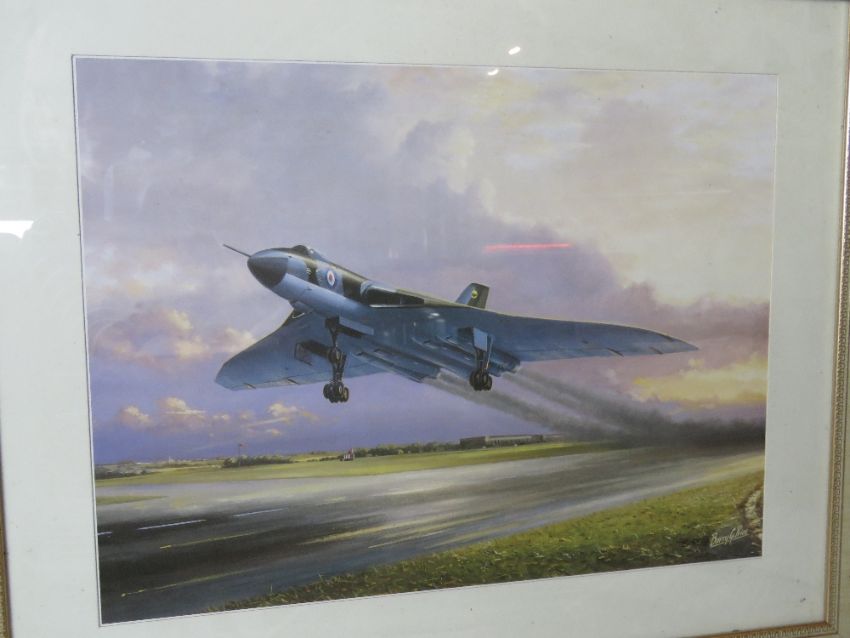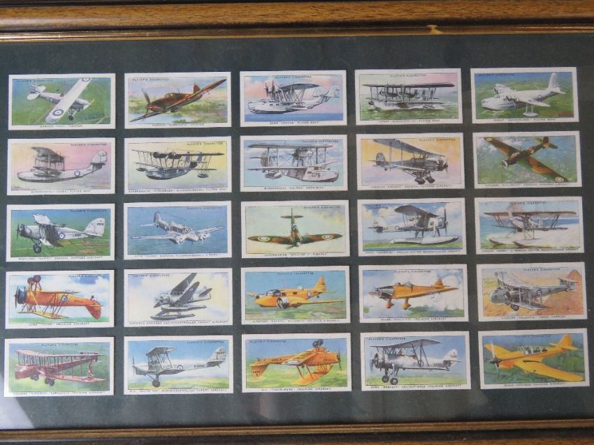 Two framed and glazed military aircraft prints, together with a framed set of Players cigarette cards featuring spitfire, hurricane, hawker, etc.