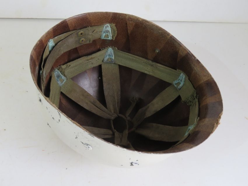 A 1970s US M1 MP helmet liner and a 1955 M1 MP liner.
