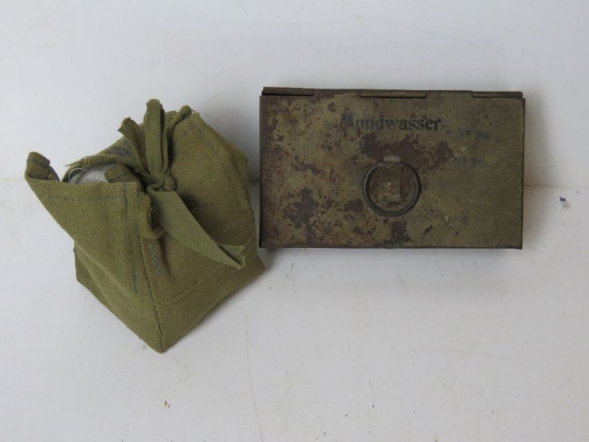 A WWII German Wehrmacht First Aid bandage in pouch together with a WWII German Military mouth wash tin, with stencilling,