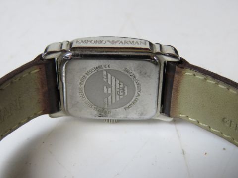 An Emporio Armani ladies watch in original box on original Armani embossed leather strap, stainless steel case numbered AR0205