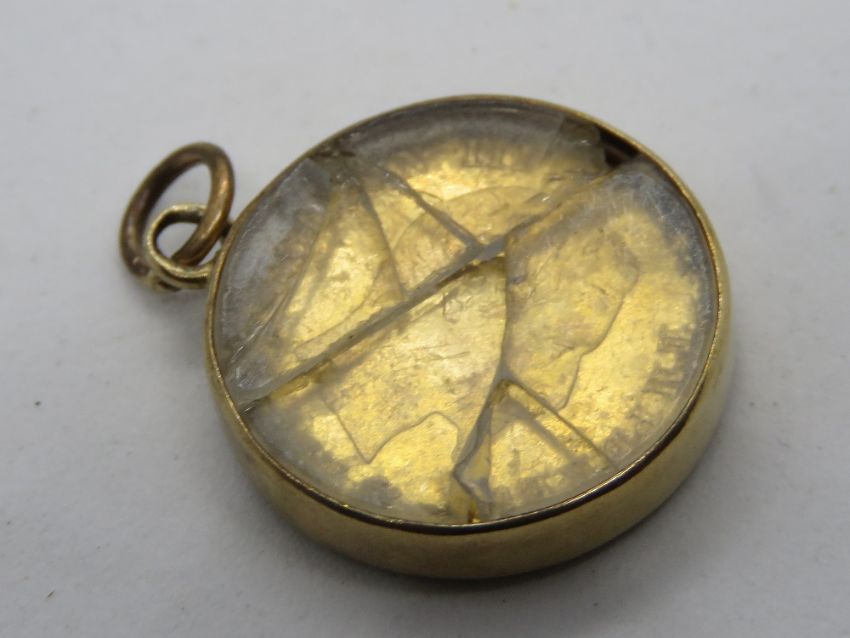 An 1859 Napoleon III 5 francs coin in 9ct gold glazed frame (glass a/f), stamped 9ct to frame, total weight 3.9g.