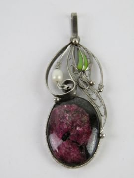A handmade filigree floral pendant having large purple stone, 5.5cm inc bale.